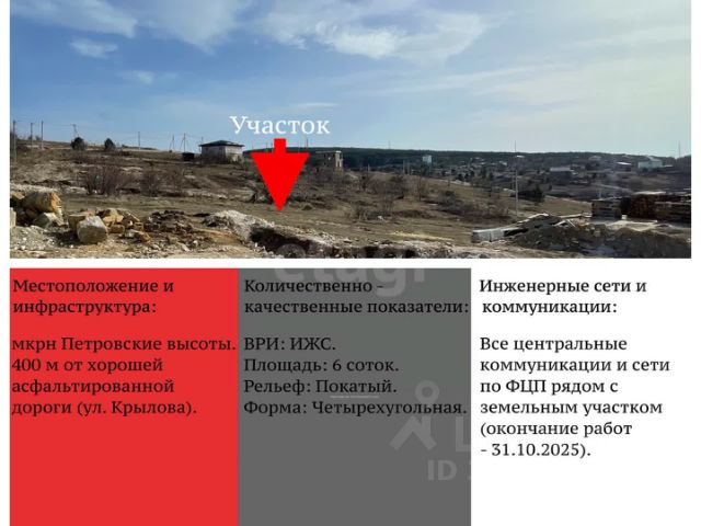Уникальное предложение по продаже земельного участка площадью 6 соток. Это редкое предложение на рынке. Участок ровный, пpaвильной геометрии, 20 на 30 метров. Ровный рельеф местности минимизирует затраты на подготовительные работы и позволяет незамедлительно приступить к строительству. Таких предложений и локаций в городе единицы, предложение для тех, кто мечтает о строительстве собственного дом. Угловой участок, расположен на первой линии на пересечении двух улиц, данная локация обеспечивает легкодоступный подъезд к нему. Он прилегает к асфальтированной дороге, а ровный рельеф позволяет без лишних затрат начать строительство. Хорошо развита транспортная и социальная инфраструктура. В шаговой доступности школы, детские сады, детская больница, спортивные секции, магазины разной направленности, заведения общественного питания, Регулярно ходит общественный транспорт, рядом с участком расположена остановка, удобный и быстрый выезд на Ялтинское шоссе и объездную дорогу, до г.Алушта 43 км. Это практичный и лучший вариант для тех, кто ценит развитую инфраструктуру и стремится к реализации собственного проекта в городе без осложнений, связанных с удаленными или труднодоступными локациями. Категория земель земли населенных пунктов, участок расположен в территориальной зоне Ж-1 (Для индивидуального жилищного строительства и Блокированная жилая застройка), что предоставляет свободу в выборе типа будущего дома. Возможно строить для себя индивидуально так и для нескольких близких семей, желающих проживать в одном доме, но со своими отдельными жилыми помещениями (танхаус). Ключевое преимущество — расположение всех центральных городских коммуникаций по границам участка, что обеспечивает прямую техническую возможность для подключения без дополнительных протяжек. Объект 10564486 МЫ ГАРАНТИРУЕМ ФИНАНСОВУЮ БЕЗОПАСНОСТЬ ДЛЯ НАШИХ КЛИЕНТОВ. Полное юридическое сопровождение сделки. Высокий шанс одобрения ипотеки. Звоните, с удовольствием ответим на ваши вопросы! Код пользователя: 195691 Номер в базе: 10564486 Загородная недвижимость на улице Родниковая в городе Симферополь.