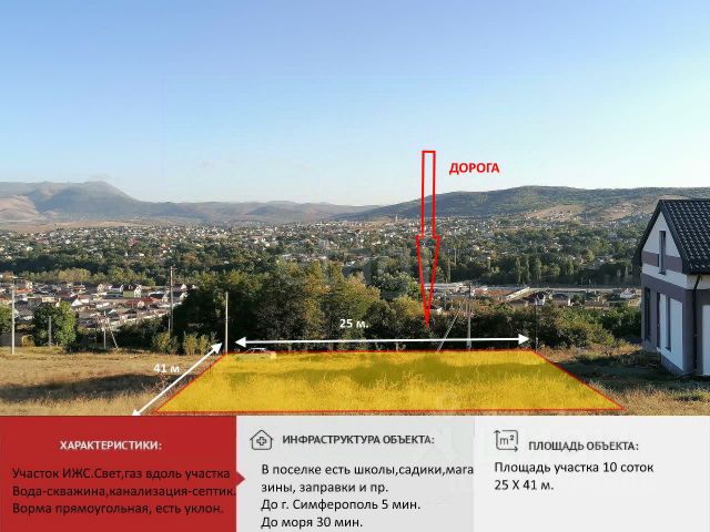 Арт. 134157383 Земельный участок в живописном пригороде Симферополя! Симферопольский район, с. Доброе, ул. Весенняя. Общая площадь участка 13,57 сотки. По факту почти 15 соток (от границ соседских заборов). Категории земель: земли населенных пунктов. Виды разрешенного использования: для индивидуального жилищного строительства. Кадастровый номер 90:12:040103:1012 Участок с небольшим уклоном в глубь участка, чистый, с трех сторон имеется забор соседей. Удобные подъездные пути. Коммуникации: по границе участка свет, газ. Инфраструктура района: школа в пешей доступности, различные магазины, Пуд, Амбар, Доброцен, аптеки, строительные и авто магазины, храм, стоматология, заправка, мойка... Экологически чистый район, рядом лес. До побережья Алушты 25 минут на машине, до Симферополя 10-15. Один собственник, документы готовы к продаже. При просмотре возможен небольшой торг реальному покупателю! Купить загородную недвижимость на улице Весенняя в селе Доброе.