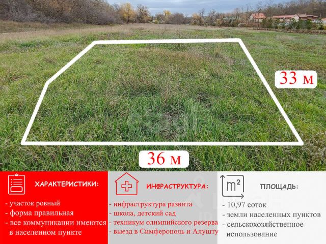 Продаётся земельный участок в Краснолесье! Большая новая нарезка в поле, можно также купить смежные участки! Участок ровный, с хорошей формой — в виде прямоугольника, 10,97 соток! Транспортная доступность: - удобная развязка во все направления Крыма; - 25 км до пляжей Алушты; - 20 км до Симферополя. Все коммуникации в населенном пункте. Инфраструктура развитая: - супермаркеты, строительные магазины, различные сервисы; - новый медпункт; - автобусные остановки; - коттеджный посёлок Малая Швейцария; - школа и детский сад; - футбольное поле; - техникум олимпийского резерва. Звоните прямо сейчас в агентство недвижимости "Этажи" — мы гарантируем, что сделаем всё возможное для вашего комфортного и выгодного приобретения. Код объекта: 10458820. МЫ ГАРАНТИРУЕМ ФИНАНСОВУЮ БЕЗОПАСНОСТЬ ДЛЯ НАШИХ КЛИЕНТОВ. Полное юридическое сопровождение сделки. Высокий шанс одобрения ипотеки. Звоните, с удовольствием ответим на ваши вопросы! Код пользователя: 172148 Номер в базе: 10458820