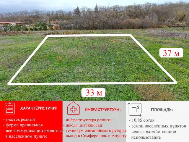 Продаётся земельный участок в Краснолесье! Большая новая нарезка в поле, можно также купить смежные участки! Участок ровный, с хорошей формой — в виде прямоугольника, 10,85 соток! Транспортная доступность: - удобная развязка во все направления Крыма; - 25 км до пляжей Алушты; - 20 км до Симферополя. Все коммуникации в населенном пункте. Инфраструктура развитая: - супермаркеты, строительные магазины, различные сервисы; - новый медпункт; - автобусные остановки; - коттеджный посёлок Малая Швейцария; - школа и детский сад; - футбольное поле; - техникум олимпийского резерва. Звоните прямо сейчас в агентство недвижимости "Этажи" — мы гарантируем, что сделаем всё возможное для вашего комфортного и выгодного приобретения. Код объекта: 10459622. МЫ ГАРАНТИРУЕМ ФИНАНСОВУЮ БЕЗОПАСНОСТЬ ДЛЯ НАШИХ КЛИЕНТОВ. Полное юридическое сопровождение сделки. Высокий шанс одобрения ипотеки. Звоните, с удовольствием ответим на ваши вопросы! Код пользователя: 172148 Номер в базе: 10459622