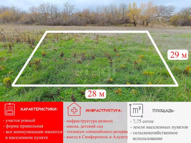 Продаётся земельный участок в Краснолесье! Большая новая нарезка в поле, можно также купить смежные участки! Участок ровный, прямоугольный, 7,75 соток! Транспортная доступность: - удобная развязка во все направления Крыма; - 25 км до пляжей Алушты; - 20 км до Симферополя. Все коммуникации в населенном пункте. Инфраструктура развитая: - супермаркеты, строительные магазины, различные сервисы; - новый медпункт; - автобусные остановки; - коттеджный посёлок Малая Швейцария; - школа и детский сад; - футбольное поле; - техникум олимпийского резерва. Звоните прямо сейчас! Код объекта: 10478439. МЫ ГАРАНТИРУЕМ ФИНАНСОВУЮ БЕЗОПАСНОСТЬ ДЛЯ НАШИХ КЛИЕНТОВ. Полное юридическое сопровождение сделки. Высокий шанс одобрения ипотеки. Звоните, с удовольствием ответим на ваши вопросы! Код пользователя: 172148 Номер в базе: 10478439