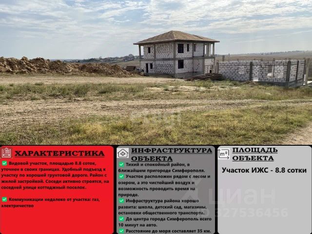 Продается участок 8.8 соток под строительство дома в селе Мирное! Мечтаете о собственном доме в тихом и живописном месте? Тогда это предложение для вас! Почему этот участок? 8.8 соток, категория ИЖС с четкими границами — идеальный размер для строительства дома и обустройства сада. Удобный подъезд по хорошей грунтовой дороге. Рядом уже есть газ и электричество — все для комфортной жизни. Участок находится в спокойном районе с жилой застройкой, где соседи активно строятся и живут круглый год. Природа и экология: Рядом лес и озеро — свежий воздух, прогулки и отдых на природе прямо под боком. Тишина и уют — идеальное место для жизни за городом. Инфраструктура: В шаговой доступности: школа, детский сад, магазины и остановки общественного транспорта. До центра Симферополя всего 10 минут на машине. До моря — 35 км, что удобно для поездок на пляж. Документы: Все оформлено по закону, готово к сделке. Не упустите шанс! Звоните прямо сейчас, чтобы узнать подробности и организовать просмотр участка. Добавляйте объявление в избранное, чтобы не потерять! Номер объекта: 2695198 МЫ ГАРАНТИРУЕМ ФИНАНСОВУЮ БЕЗОПАСНОСТЬ ДЛЯ НАШИХ КЛИЕНТОВ. Полное юридическое сопровождение сделки. Высокий шанс одобрения ипотеки. Звоните, с удовольствием ответим на ваши вопросы! Код пользователя: 156394 Номер в базе: 2695198