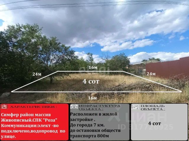 Внимание!!! Прекрасная инвестиция и выгодное предложение! Предлагаем Вам приобрести земельный участок 8 соток, ровный, прямоугольной формы, расположен вблизи города Симферополь в селе Солнечное, Симферопольского района. Категория земель: Земли поселений (земли населенных пунктов) индивидуальное жилищное строительство. Проведено межевание, документы Российского образца и готовы к продаже. Есть все коммуникации, а также имеется вся инфраструктура: магазины, мед. учреждение, детский сад, маршрутный транспорт. До города можно доехать за 15 минут на своём авто и за 25 минут на общественном, до остановки меньше 5 минут, до города 8 км, до моря меньше часа езды. Уникальное предложение за данную цену! Звоните прямо сейчас участок ждёт именно Вас! Код объекта: 9669555 МЫ ГАРАНТИРУЕМ ФИНАНСОВУЮ БЕЗОПАСНОСТЬ ДЛЯ НАШИХ КЛИЕНТОВ. Полное юридическое сопровождение сделки. Высокий шанс одобрения ипотеки. Звоните, с удовольствием ответим на ваши вопросы! Код пользователя: 192167 Номер в базе: 9669555
