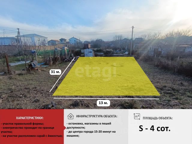 Земельный участок площадью 4 сотки расположен в массиве "Живописное" СПК "Дружба" (Трудовское сельское поселение) в 5 км от Симферополя. Участок полностью огорожен еврозабором, оборудован воротами и заездом для автомобиля. Подключено электричество 380 В (оформлено), есть возможность подключения к центральному водоснабжению, а также скважина. На территории имеется отдельный подвал и готовый фундамент (возраст 2 года), что ускоряет процесс строительства. Со смежным участком будет установлен забор. Возможна прописка. Транспортная доступность хорошая: общественный транспорт курсирует регулярно с 6:00 до 23:00. В пешей доступности (300 м) находятся магазины, включая "Валберис", а в 600 м расположена автобусная остановка. Участок подходит для постоянного проживания или строительства загородного дома, с удобной логистикой в город. Документы оформлены в соответствии с законодательством РФ. Доступны варианты покупки в ипотеку — ипотечный брокер поможет подобрать оптимальные условия и оформить заявку в банки, работающие с земельными участками. Участок готов к осмотру в удобное для Вас время. Номер объекта: 7788828. МЫ ГАРАНТИРУЕМ ФИНАНСОВУЮ БЕЗОПАСНОСТЬ ДЛЯ НАШИХ КЛИЕНТОВ. Полное юридическое сопровождение сделки. Высокий шанс одобрения ипотеки. Звоните, с удовольствием ответим на ваши вопросы! Код пользователя: 116175 Номер в базе: 7788828 Загородная недвижимость в селе Ана-Юрт Симферопольского района.