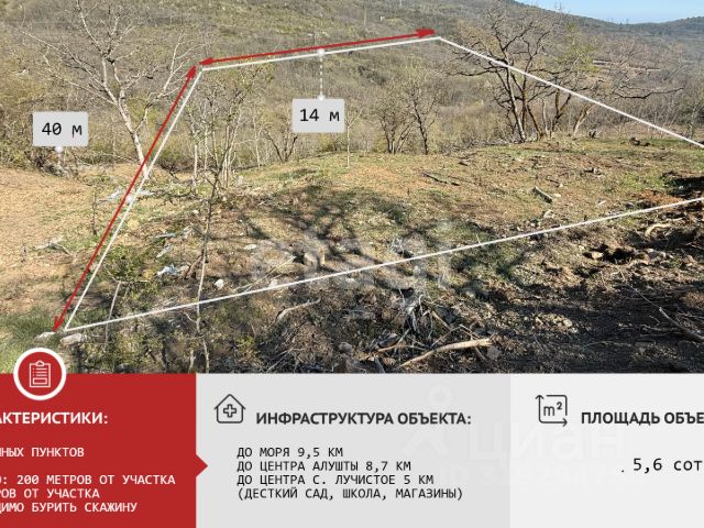 В продаже видовой (вид на гору Демерджи) земельный участок в экологичном месте. Площадь земельного участка 6,7 соток. Участок расположен в п. Лучистое, в ближайших окрестностях города-курорта Алушта. Отличная локация для строительства жилого дома и постоянного проживания.