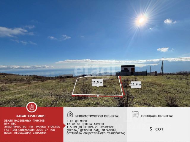 В продаже видовой (360 градусов вид на горы, Алушту) земельный участок в экологичном месте. Площадь земельного участка 5 соток. Участок расположен в п. Лучистое, в ближайших окрестностях города-курорта Алушта. Отличная локация для строительства жилого дома и постоянного проживания. Удобный подъезд прямо к участку.