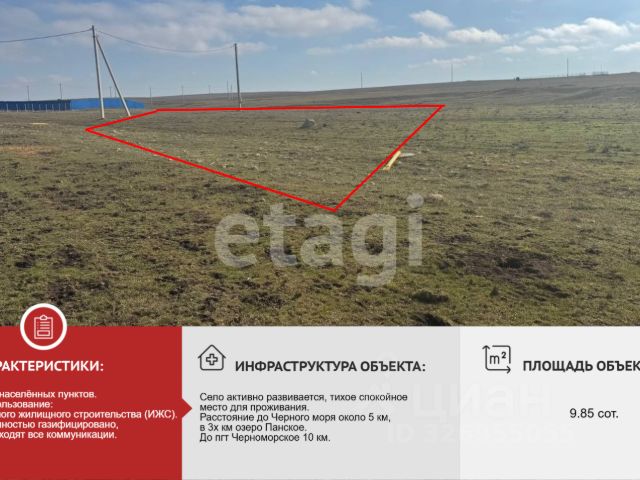 Продается участок у моря! Уникальное предложение для тех, кто мечтает о собственном уголке на побережье Черного моря! Участок площадью 10 соток для индивидуального жилищного строительства в живописном селе Снежное Черноморского района. Почему это отличное предложение: Близость к морю: всего 2,5 км до песчаного пляжа. Панорамный вид: великолепные виды на море, бухту и озеро Панское. Инфраструктура: село газифицировано, а электричество рядом с участком. Документы РФ: участок в собственности, все документы готовы к сделке, межевание проведено. Для активного отдыха: всего в 3 км расположены базы кайт- и виндсерфинга с возможностью аренды снаряжения и обучения. Цена одна из самых привлекательных на рынке! Если вы хотите приобрести выгодный участок у моря, это ваш шанс! Звоните сейчас и узнайте подробности!
