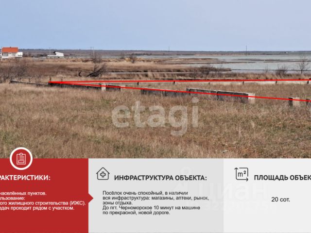 Вашему вниманию участок участок 5сот. ИЖС-до Евпатории 70 км-до Аэропорта 140 км-до Симферополя 150 кмВ посёлке центральные водоснабжение и газ.Также Межводном есть все для комфортного проживания:средняя общеобразовательная школа, амбулатория, дом культуры, библиотека, отделение почты, отделение банка, аптека, магазины, кафе и рестораны, рынок и АЗС, гостиницы.Курортный сезон в Межводном начинается с мая (вода прогревается до +18 уже) и заканчивается в октябре (воздух +26, вода +18-22). При этом, пиковый сезон — июль, август, когда температура воды +23-25 градусов, а воздуха +30-35. Кроме песчаного пляжа, в Межводном есть и небольшие живописные скалы. В Межводном нет и сильных течений, что положительно сказывается на температуре воды.Документы РФ полностью готовы к сделке! Номер объекта: #1/544106/14415 Купить участок под индивидуальное жилое строительство с коммуникациями в Черноморском районе республики Крым.