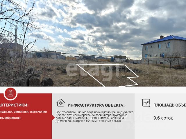 Продаётся видовой участок ,в шестистах метров от моря.в поселке городского типа Черноморское. Общая площадь земельного участка 960 кв.м. Назначение земельного участка -для индивидуального жилищного строительства. Все коммуникации рядом. По улице проходит свет, газовая труба и центральный водопровод. Вокруг жилая застройка. Участок находится в 600 метрах от моря. Черноморское - приморский поселок на западном берегу Крыма. В поселке хорошо развита инфраструктура: школы, детские сады, магазины, аптеки, МФЦ, спортплощадки. Самый красивый пляж с бирюзовой водой и белым песком. Хорошее транспортное сообщение во все стороны Крыма. Документы готовы к сделке! Звоните, пишите по всем вопросам. МЫ ГАРАНТИРУЕМ ФИНАНСОВУЮ БЕЗОПАСНОСТЬ ДЛЯ НАШИХ КЛИЕНТОВ. Полное юридическое сопровождение сделки. Высокий шанс одобрения ипотеки. Звоните, с удовольствием ответим на ваши вопросы! Код пользователя: 182478 Номер в базе: 5698821