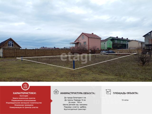 Объект 580. Продам земельный участок площадью 5,6 соток, пгт. Заозёрное в районе Песчанка, пригород Евпатории. Документы РФ, проведено межевание. Категория земель: Земли населённых пунктов. Разрешенное использование: Индивидуальное жилищное строительство. Коммуникации: электричество подключено, вода центральные и газ в перспективе. Участок огорожен забором, подключено электричество. Рядом расположены, гостиницы, дома. На лечение грязями в Заозерном ежегодно приезжает огромное количество отдыхающих, для эффективного оздоровления. В регионе располагается более десятка соленых озер с уникальными по составу грязями и рапой, которые широко используют в местных санаториях. Самым известным считается озеро Мойнаки около Евпатории, и именно его богатства используют во время лечения грязями в Заозерном. Прямой выход к пляжу (песчаный берег). Участок расположены 800 метров от моря, 10 км до Евпатории. Городская транспортная развязка в 7 минутах. Продаю участок ижс.