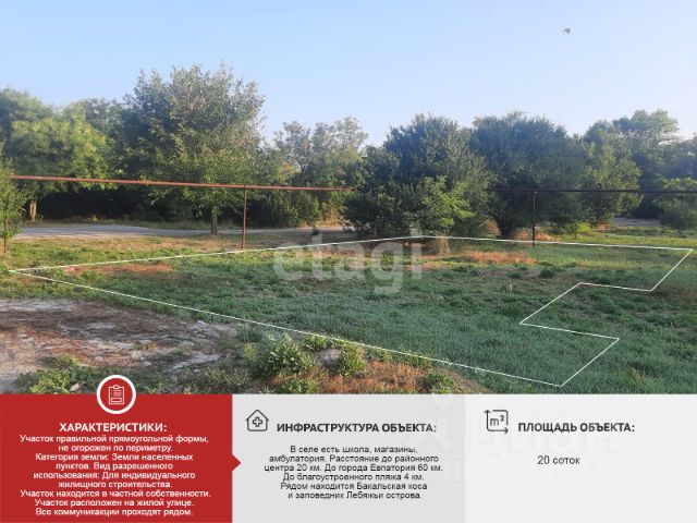 Участок находится близко к центру села и всем удобствам(магазины, детские и спортплощадки, пункты выдачи заказов популярных маркетплейсов). Теплое, чистое море с песчаным пляжем в 3 км. Ближайший город-курорт Евпатория находится в 60 км(новые хорошие дороги). Село оснащено уличными фонарями, зонами досуга и отдыха, школой и детским садом, ФАБ.
