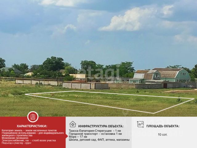 Продается земельный участок 9 соток . Категория земель - земли населенных пунктов . Разрешенное использование- для индивидуального жилищного строительства. До города Евпатории 11 км. по новой трассе 15 минут езды. До моря 12 км. В поселке вся инфраструктура рядом. Возможно подключение света ,газа , централизованной воды. Документы РФ готовы к сделке. Возможен оперативный показ. При звонке сообщите нам, пожалуйста, номер: Z4267
