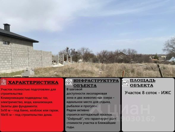 Участок газифицирован, имеется центральный водопровод, проведена электроэнергия. Все коммуникации размещены по границе участка. В наличии 900 альминских камней, сложенных в стопку для строительных нужд (входят в стоимость).