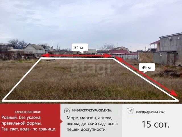Прекрасная возможность для приобретения земельного участка на западном побережье Крыма! Участок расположен в пгт. Николаевка, по адресу: пер. Курортный, 21, всего в 40 км от Симферополя. Площадь участка составляет 15 соток и имеет категорию ИЖС. Все необходимые коммуникации — газ, электричество, вода и центральная канализация — находятся на границе участка. Участок правильной прямоугольной формы и не разработан, что дает вам свободу для реализации своих идей. Удачное расположение в шаговой доступности от моря и удобные подъездные пути по асфальтированной дороге. Соседи живут здесь круглый год. Поселок предлагает развитую инфраструктуру: остановки общественного транспорта, рынок, супермаркеты, магазины, аптека, детский сад и школы — всё в непосредственной близости. Наслаждайтесь чистейшим морем и великолепными закатами! Документы оформлены по российским стандартам. Не упустите шанс создать свой идеальный уголок на природе! Звоните для получения дополнительной информации! Номер объекта: 4387470 МЫ ГАРАНТИРУЕМ ФИНАНСОВУЮ БЕЗОПАСНОСТЬ ДЛЯ НАШИХ КЛИЕНТОВ. Полное юридическое сопровождение сделки. Высокий шанс одобрения ипотеки. Звоните, с удовольствием ответим на ваши вопросы! Код пользователя: 92806 Номер в базе: 4387470 Купить участок под индивидуальное жилое строительство с коммуникациями в поселке городского типа Николаевка Симферопольского района.
