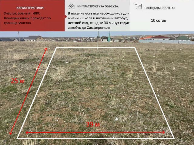 Объект 24158. Предлагаем привлекательный земельный участок 6 соток - идеальное место для строительства жилого дома! Этот участок- ваша возможность создать уютное пространство для жизни и отдыха. Преимущества: - Участок находится всего в 10 минутах езды от Симферополя. - Участок расположен в комфортном и развитом с. Урожайное, где соседи активно строятся, что создает уютную атмосферу для жизни. В нем есть все необходимое для комфортной жизни: школа, детский сад, магазины, аптека и множество детских площадок для детей. - Подъездные пути обеспечивают легкий доступ к участку в любое время года. - Ходит общественный транспорт в Симферополь, что делает поездки в город легкими и комфортными. Коммуникации: - Электричество -есть возможность подключения. - Газ-есть возможность подключения. Не упустите шанс приобрести участок вашей мечты! Форма участка с размерами 18*33 м позволит воплотить любые архитектурные решения при строительстве жилого дома нашей строительной компанией ИЛИОН-строй. Компания ИЛИОН профессионально подберет недвижимость любого типа, исходя из Ваших пожеланий и бюджета, предлагая лучшие условия рынка. Продаю земельный участок под ижс в селе Урожайное Симферопольского района.
