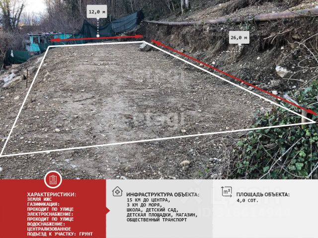 Участок крайний в посёлке. Статус ИЖС. Места для стройки валом. Имеет каскадный ландшафт. Обнесён забором который заплетён ежевикой, как колючей проволокой. Много плодовых деревьев. Вишня, слива, лавр, инжиры, орехи, виноград. Роща вокруг очень тенисто летом, внизу , огромный виноградник. До моря 800 м(вниз пешком 20 минут вверх 30 на машине 5 мин) обычная инфраструктура-магазы, почта, садик, в шаговой доступности.
