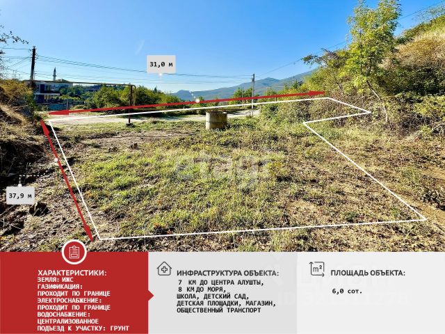 Продается земельный участок в селе Изобильное г. Алушта. Площадь земельного участка 5 соток. Отличная локация для строительства жилого дома. В селе магазины, школа, амбулатория, клуб, детская площадка, остановка общественного транспорта. Чистый горный воздух.