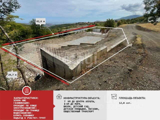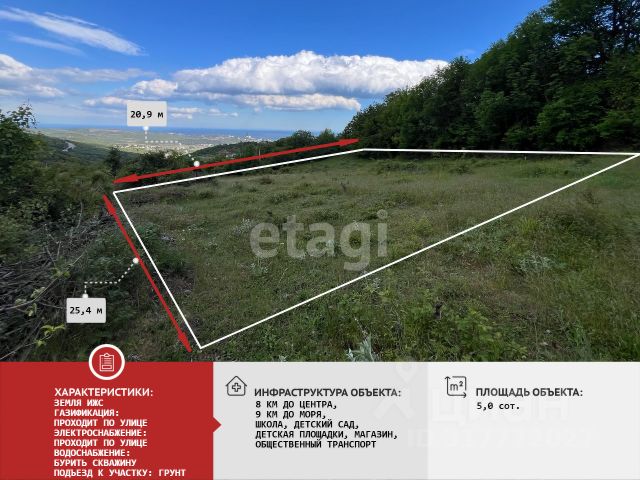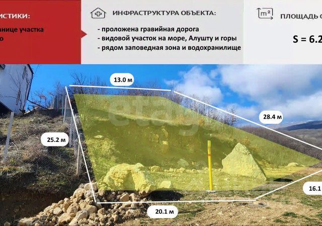 Лучший вид море с любой точки участка. В продаже видовой (360 градусов вид на море, горы, Алушту) земельный участок в экологичном месте. Площадь земельного участка 8 соток. Участок расположен в с. Изобильное, в ближайших окрестностях города-курорта Алушта. Отличная локация для строительства жилого дома и постоянного проживания. Удобный подъезд прямо к участку. Лечебный горный воздух. Тишина, спокойствие и умиротворение этого места не оставят Вас равнодушным. Электричество столб возле участка. Газ возле участка. Вода по границе участка. Документы РФ, один собственник, без обременения, ИЖС, быстрый выход на сделку. Земли поселений для индивидуального жилищного строительства. Село Изобильное расположено на Южном берегу Крыма. Расстояние до Алушты около 5 километров (по шоссе) к северу, ближайшая железнодорожная станция — Симферополь-Пассажирский — примерно в 43 километрах. Транспортное сообщение осуществляется по региональной автодороге, соединяющей трассу Симферополь — Ялта с шоссе Алушта — Судак. В селе: школа, детский сад, ФАП, магазины, аптека, рынок. Пишите или звоните! С большим удовольствием ответим на все вопросы и организуем персональную презентацию в любое удобное вам время! Компания "ЭТАЖИ" является официальным партнером всех ведущих банков: РНКБ, ГЕНбанк, банк России, Промсвязьбанк, СБЕР. У наших клиентов, есть возможность направить пакет документов на получение ОДОБРЕНИЯ ипотеки прямо из нашего офиса по всем банкам! Юристы компании "ЭТАЖИ" предоставляют полное сопровождение сделки. Электронная регистрация сделки, поможет Вам ускорить процесс переоформления и сэкономить Ваши денежные средства. Компания "ЭТАЖИ" - лучшее решение для покупателей! Самую большую базу недвижимости, Вы можете найти на нашем официальном сайте! код объекта: 5795663 МЫ ГАРАНТИРУЕМ ФИНАНСОВУЮ БЕЗОПАСНОСТЬ ДЛЯ НАШИХ КЛИЕНТОВ. Полное юридическое сопровождение сделки. Высокий шанс одобрения ипотеки. Звоните, с удовольствием ответим на ваши вопросы! Код пользователя: 159388 Номер в базе: 5795663