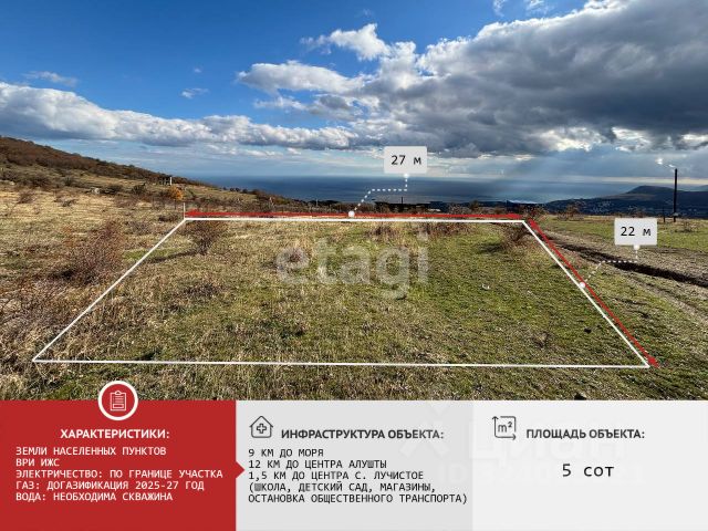 Здесь солнце встает раньше, чем у остальных. В продаже видовой земельный участок в экологичном месте. Площадь земельного участка 15,6 сотки. Участок расположен в с. Лучистое, в ближайших окрестностях города-курорта Алушта. Отличная локация для строительства жилого дома или экокемпинга. Удобный подъезд прямо к участку. Лечебный горный воздух. Чистейшая питьевая вода из источников горы Демерджи. Тишина, спокойствие и умиротворение этого места не оставят Вас равнодушным. Документы РФ, один собственник, без обременения, ИЖС, быстрый выход на сделку. Земли поселений для ведения личного подсобного хозяйства. Возможно купить смежные участки. Пишите или звоните! С большим удовольствием ответим на все вопросы и организуем персональную презентацию в любое удобное Вам время! Компания "ЭТАЖИ" является официальным партнером всех ведущих банков: РНКБ, ГЕНбанк, банк России, Промсвязьбанк, СБЕР. У наших клиентов есть возможность направить пакет документов на получение ОДОБРЕНИЯ ипотеки прямо из нашего офиса по всем банкам! Юристы компании "ЭТАЖИ" предоставляют полное сопровождение сделки. Электронная регистрация сделки поможет Вам ускорить процесс переоформления и сэкономить Ваши денежные средства. Компания "ЭТАЖИ" - лучшее решение для покупателей! Код объекта: 4491921 МЫ ГАРАНТИРУЕМ ФИНАНСОВУЮ БЕЗОПАСНОСТЬ ДЛЯ НАШИХ КЛИЕНТОВ. Полное юридическое сопровождение сделки. Высокий шанс одобрения ипотеки. Звоните, с удовольствием ответим на ваши вопросы! Код пользователя: 171727 Номер в базе: 4491921