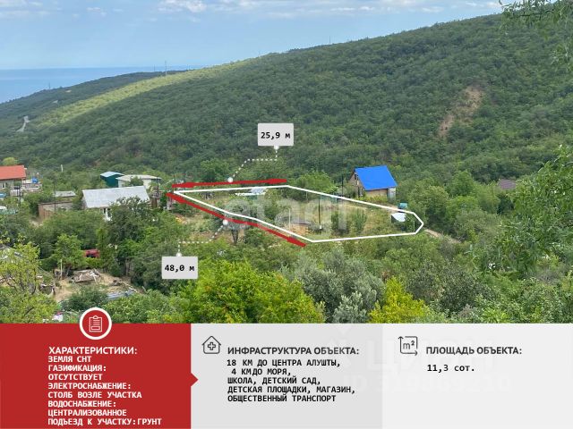 Участок с видом на море, на горы в садоводстве 16 км от Алушты. Снт Победа со всеми коммуникациями, со своей парковкой на въезде. Много постоянно проживающих соседей. Электричество- 3м, водопровод - 10м. Газ обещают вместе с Семидворьем. Участок отеррасирован в 2 уровня, есть место для дома, для видовой террасы и для посадок. Членские взносы 5000р за год. Собственность оформлена, межевание выполнено. садоводство находится на 16 км от Алушты в сторону Судака. Рядом находится природная достопримечательность - Каменные грибы в долине Сотера.. С участка видно Корону г.Демерджи. Прекрасное место для строительства дачи для крымчан и для остальных любителей Крыма. До моря 10 мин на машине.