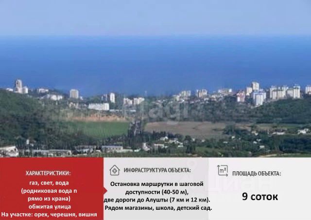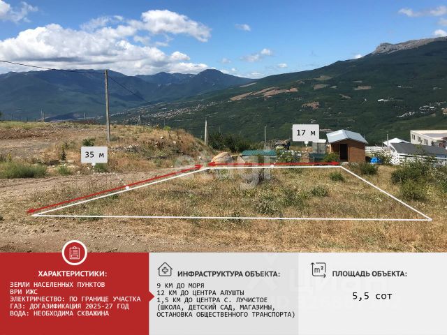 Лучше гор могут быть только горы. В продаже видовой (360 градусов вид на горы, Алушту) земельный участок в экологичном месте. Площадь земельного участка 5 соток. Участок расположен в п. Лучистое, в ближайших окрестностях города-курорта Алушта. Отличная локация для строительства жилого дома и постоянного проживания. Удобный подъезд прямо к участку. Лечебный горный воздух. Чистейшая питьевая вода из источников горы Демерджи. Тишина, спокойствие и умиротворение этого места не оставят Вас равнодушным. Электричество по границе участка. Новая ТП. Газ 2025 год. Вода (по воде - ежемесячный подвоз 5 м3 воды бесплатно от администрации), необходимо бурить скважину. Документы РФ, один собственник, без обременения, ИЖС, быстрый выход на сделку. Земли поселений для индивидуального жилищного строительства. Село Лучистое расположено на Южном берегу Крыма, на южном склоне горы Демерджи, у истоков ручья (балки) Алагез (Алакоз), левого притока реки Демерджи, высота центра села над уровнем моря 490 м. Расстояние до Алушты около 10 километров (по шоссе) к северу, ближайшая железнодорожная станция — Симферополь-Пассажирский — примерно в 43 километрах. Транспортное сообщение осуществляется по региональной автодороге, соединяющей трассу Симферополь — Ялта с шоссе Алушта — Судак. К северо-западу от села находится известный памятник природы — Долина Привидений. В селе: школа, детский сад, ФАП, магазины, аптека, рынок. В верхней части села у подножия г. Демерджи проходит заповедная зона и популярные туристические маршруты. Пишите или звоните! С большим удовольствием ответим на все вопросы и организуем персональную презентацию в любое удобное вам время! Компания "ЭТАЖИ" является официальным партнером всех ведущих банков: РНКБ, ГЕНбанк, банк России, Промсвязьбанк, СБЕР. У наших клиентов, есть возможность направить пакет документов на получение ОДОБРЕНИЯ ипотеки прямо из нашего офиса по всем банкам! Юристы компании "ЭТАЖИ" предоставляют полное сопровождение сделки. Электронная регистрация сделки, поможет Вам ускорить процесс переоформления и сэкономить Ваши денежные средства. Компания "ЭТАЖИ" - лучшее решение для покупателей! код объекта: 8536940 МЫ ГАРАНТИРУЕМ ФИНАНСОВУЮ БЕЗОПАСНОСТЬ ДЛЯ НАШИХ КЛИЕНТОВ. Полное юридическое сопровождение сделки. Высокий шанс одобрения ипотеки. Звоните, с удовольствием ответим на ваши вопросы! Код пользователя: 171727 Номер в базе: 8536940