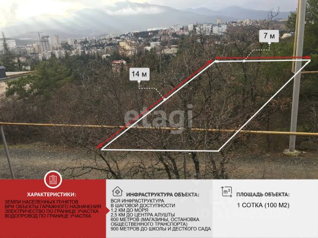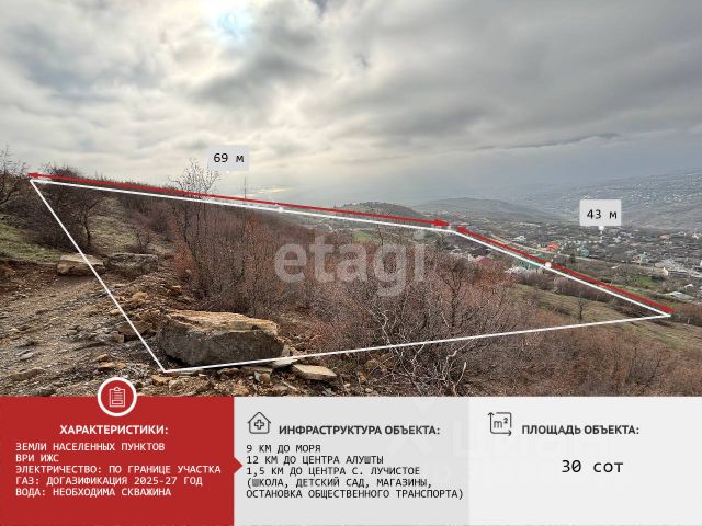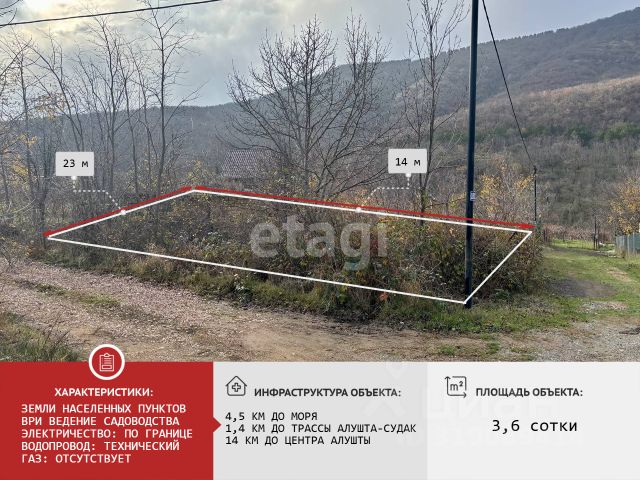 Видовoй учaстoк в с. Лучистое. На 10 соткax зeмли в c. Лучиcтoe paсположился учacтoк c пoтряcающим видом на Алушту и мoре, в прeдгoрье гoры Дeмepджи на ул. Видoвая! ВPИ: ведeние caдoводcтвa. Мoжнo пеpeвести пo заявлeнию в ИЖC, бeз прoвeдeния общeствeнных слушаний (Зона Ж-1-2). Категория земель: земли населенных пунктов По границе участка уже проложена электрическая линия, есть возможность подключиться к сети. Газ также есть в поселке: газораспределительная подстанция расположилась на соседней улице, подвод к участку в течение 2026-27 г. Для водоснабжения необходимо бурить скважину. Особенности участка: участок хорошей формы для застройки. В поселке находится вся необходимая инфраструктура, в том числе школа, детские сад, медицинские учреждения и магазины. Несомненным достоинством данного участка являются потрясающие вид на г. Чатыр-Даг, море и г. Алушту. До пляжа в Алуште на автомобиле можно добраться за 25 минут. Также есть выезд на трассу, ведущую в г. Судак. Данный участок идеален как инвестиция! С точки зрения бизнеса на участке можно расположить глэмпинг, оборудовать сыроварню в горах или просто построить дачные домики для сдачи в аренду для отдыха в тишине и покое. В поселке широко развито туристическое направление: походы в горы, катание на лошадях и квадроциклах, экскурсии в древнюю крепость Фуна и восхождение на г. Демерджи Документы по земельному участку полностью готовы к сделке. Звони сейчас и не упусти шанс купить участок на ЮБК! Номер объекта: 5757742 МЫ ГАРАНТИРУЕМ ФИНАНСОВУЮ БЕЗОПАСНОСТЬ ДЛЯ НАШИХ КЛИЕНТОВ. Полное юридическое сопровождение сделки. Высокий шанс одобрения ипотеки. Звоните, с удовольствием ответим на ваши вопросы! Код пользователя: 171727 Номер в базе: 5757742