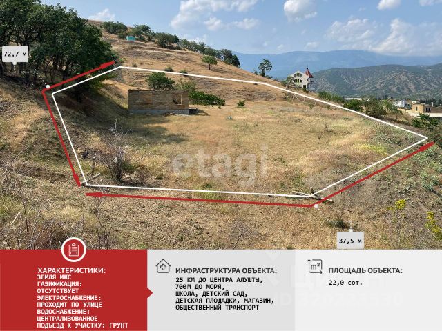 До участка - дорога с твердым покрытием. От пляжа 1 км, 15 мин пешком. Участок огорожен с трех сторон, террасы в 3 уровня. Коммуникации: центральный водопровод, электричество 3 фазы , 15 кВт.