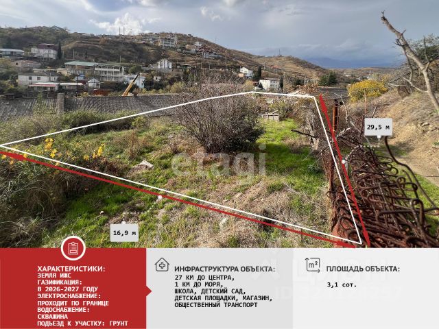 Объект 2746. Для тех, кто ищет видовой участок для строительства дома с оригинальным ландшафтным дизайном рядом с морем: Видовой участок для вашего креативного проекта в посёлке Малореченском ! 3.1 сотки с уклоном - создайте уникальный ландшафтный дизайн и наслаждайтесь жизнью у моря! Мечтаете о собственном доме в Крыму, который будет отличаться от всех остальных? Этот участок в Малореченском идеальное место для реализации ваших самых смелых архитектурных и ландшафтных идей! Уникальный рельеф: Участок с небольшим уклоном это прекрасная возможность для создания многоуровневого сада, террас, альпийских горок и других интересных элементов ландшафтного дизайна. Фантазия без границ. Отличный вид на горы и море . Коммуникации под рукой . Вода ( скважина ) , свет у границ участок. .. Многие предложения доступны только через наших агентов — обращайтесь, и мы подберём варианты, которые не публикуются публично"