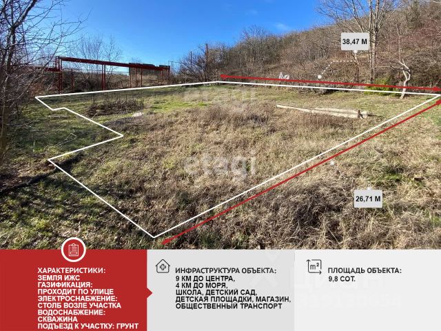 Участок-ИЖС-9,82 сот.ул. Солнечная 45. ровный, не оползневой ,подведены две дороги,газ и питьевая вода на участке,на электричество получены технические условия- 15квт.,вид на море,горы,рядом лес.Спокойное и тихое место. Получен градостроительный план земельного участка, (ГПЗУ),Торг уместен.