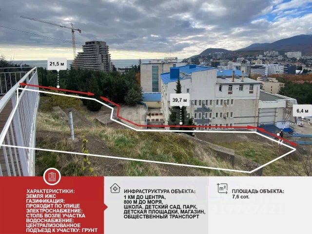 Продается уникальный земельный участок в живописной Алуште — идеальное место для вашего будущего дома! Этот привлекательный участок состоит из двух смежных участков по 766 кв.м., что в сумме составляет 15,32 сотки. Расположение — это главное преимущество! Всего в нескольких шагах от моря, вы сможете наслаждаться захватывающими видами на Черное море и величественные крымские горы прямо из окон вашего нового дома. Участок окружен хвойными деревьями, что обеспечивает чистейший воздух, напоенный ароматом хвои и морского бриза. Это идеальное место для тех, кто ценит здоровье и комфорт своей семьи. На участке уже разработан проект подключения электричества (15 кВт на каждый участок) и получены технические условия для подключения к водопроводу. Участок находится в жилом массиве с незначительным уклоном, что делает его удобным для строительства. В непосредственной близости расположены остановка общественного транспорта, магазины продуктовые и строительных материалов, рынок, школа, администрация города, а также великолепный Приморский парк и центральная набережная. Все необходимое для комфортной жизни — в шаговой доступности! Асфальтированная дорога ведет к участку, что обеспечивает легкий доступ в любое время года. Не упустите возможность стать владельцем этого райского уголка в сердце Крыма! Звоните нам, и мы с радостью покажем вам участок и ответим на все ваши вопросы! Агентство недвижимости "Этажи" — ваш надежный партнер на рынке недвижимости. С нами вы сможете быстро и безопасно осуществить свою мечту о собственном доме! Номер объекта: 2678010. МЫ ГАРАНТИРУЕМ ФИНАНСОВУЮ БЕЗОПАСНОСТЬ ДЛЯ НАШИХ КЛИЕНТОВ. Полное юридическое сопровождение сделки. Высокий шанс одобрения ипотеки. Звоните, с удовольствием ответим на ваши вопросы! Код пользователя: 1245788849 Номер в базе: 2678010
