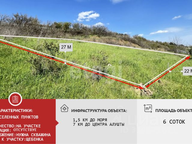 | С ВИДОМ на горы. | ДО МОРЯ 1,5 км. | Под ИЖС. Продается земельный участок в селе Солнечногорское (Алушта) улица Молодежная. Площадь: 6 соток. Назначение земельного участка: индивидуальное жилое строительство (ИЖС). Участок ровный. Подъездные пути - грунтовая дорога. Коммуникации: электричество, вода - в пределах 30 метров от участка, канализация - септик. Локация: до пляжа 1,5 км, до Алушта 23 км, до центра села Солнечногорское 1,6 км, где магазины, остановка общественного транспорта, кафе. Количество собственников: один Есть возможность ипотечного кредитования.Дополнительно оплачивается комиссия покупателя в случае подбора объектов недвижимости.Объект 86971