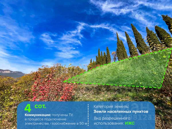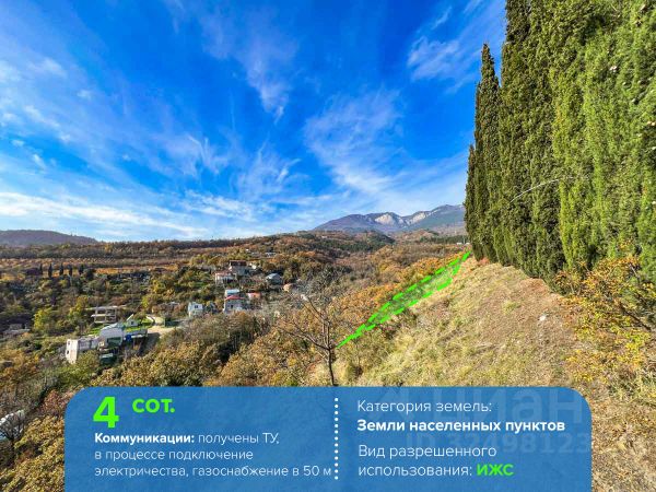 | С ВИДОМ на море | ДО МОРЯ 2,5 км | Под ИЖС. Продается земельный участок в поселке городского типа Партенит (Алушта) улица Крымской весны. Площадь: 4 сотки. Назначение земельного участка: для индивидуального жилищного строительства. Асфальтированный подъезд и неперекрываемый вид на море. Коммуникации: получены технические условия, в процессе подключение электричества, газоснабжение в 50 м от участка. Локация: до пляжа 2,5 км, до автостанции 800 м, до супермаркета 800 м, до поликлиники 1,9 км Количество собственников: один Есть возможность ипотечного кредитования.Дополнительно оплачивается комиссия покупателя в случае подбора объектов недвижимости.Объект 107513