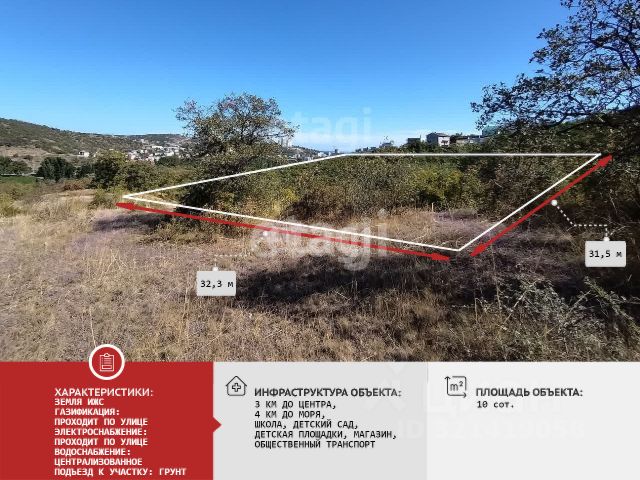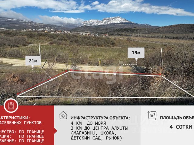 | С ВИДОМ на горы. | ДО МОРЯ 2,5 км. | Под ИЖС. Продается земельный участок в городе Алушта, улица Северная. Площадь: 4 сотки. Назначение земельного участка: индивидуальное жилищное строительство (ИЖС). Участок правильной формы 19 на 21 метр, умеренный рельеф, подъездная дорога грунт, район активно расстраивается. Коммуникации: на участок заведен центральный водопровод (договор, лицевой счет, счетчики), заключен договор с Крымэнерго и установлен столб (ждем подключения), газ в перспективе, получен адрес. Локация: до центра города 2 км, до школы и детского сада 1,5 км, до магазинов, супермаркетов, остановки общественного транспорта 1 км. Количество собственников: один Есть возможность оформить ипотечное кредитование.Дополнительно оплачивается комиссия покупателя в случае подбора объектов недвижимости.Объект 68417