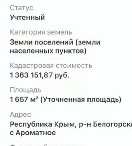 Продам участок, общая площадь 15 сот., назначение ИЖС. Участок ровный без насаждений. Находится в Белогорском р-не, Ароматновское сельское поселение, с. Ароматное, Добрая ул. Коммуникации: столб возле участка, вода скважина, газ в проекте. В селе есть школа и магазины, район очень расстраивается. Подъездной путь отсыпан щебнем, 500 метров до асфальта. Цена очень хорошая - успейте приобрести! В этом месте Вас будет радовать пение птиц и природа. Постройте дом своей мечты, звоните. Номер объекта: 2811411 МЫ ГАРАНТИРУЕМ ФИНАНСОВУЮ БЕЗОПАСНОСТЬ ДЛЯ НАШИХ КЛИЕНТОВ. Полное юридическое сопровождение сделки. Высокий шанс одобрения ипотеки. Звоните, с удовольствием ответим на ваши вопросы! Код пользователя: 102570 Номер в базе: 2811411 Земельный участок в селе Ароматное Белогорского района.