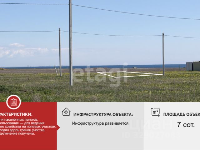 Продается участок 7 соток у села Громово с видом на море! Категория — земли населенных пунктов, разрешенное использование — для ведения личного подсобного хозяйства на полевых участках. Земля имеет ровный рельеф и правильную прямоугольную форму, периметр не огорожен. Линия электропередач вдоль границ участка, техусловия на подключение получены. Участок расположен вблизи косы Беляус, известной своими широкими песчаными пляжами и чистейшим морем — это место часто называют Крымскими Мальдивами. До моря всего 250 метров. Район отличается экологической чистотой и обладает значительным туристическим и инвестиционным потенциалом, здесь активно ведется застройка. Инфраструктура развивается: в скором времени будет проложена линия электропередач. Отличные новые дороги с выходом на трассу "Таврида" и к мысу Тарханкут. Все документы оформлены по законодательству РФ. Готов предоставить дополнительную информацию и ответить на все вопросы по телефону. МЫ ГАРАНТИРУЕМ ФИНАНСОВУЮ БЕЗОПАСНОСТЬ ДЛЯ НАШИХ КЛИЕНТОВ. Полное юридическое сопровождение сделки. Высокий шанс одобрения ипотеки. Звоните, с удовольствием ответим на ваши вопросы! Код пользователя: 183659 Номер в базе: 12301472