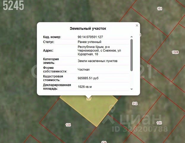 Продается земельный участок 10 соток в селе Снежное Межводненского сельского поселения Черноморского района. К селу подходит асфальтированная дорога. Село полностью газифицировано, рядом с участком проходит линия электропередач, в селе есть центральный водопровод. Участок правильной прямоугольной формы, вид разрешенного использования земли-индивидуальное жилищное строительство. Участок выходит с одной стороны на главную улицу, с другой на трассу, очень удобный подъезд. С земельного участка открывается очень красивый вид на море и Панское озеро, дорожная развязка хорошая, доступно все, что нужно для жизни. До Межводного 2,5 км. Документы РФ готовы к сделке, по запросу предоставлю видеообзор. МЫ ГАРАНТИРУЕМ ФИНАНСОВУЮ БЕЗОПАСНОСТЬ ДЛЯ НАШИХ КЛИЕНТОВ. Полное юридическое сопровождение сделки. Высокий шанс одобрения ипотеки. Звоните, с удовольствием ответим на ваши вопросы! Код пользователя: 182478 Номер в базе: 11931488