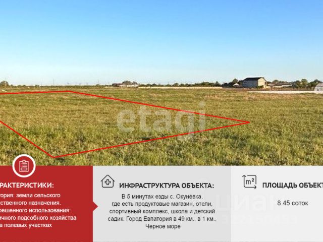 Объект 92814 | участок с видом на море | ДО МОРЯ 200 м | участок под ИЖС Продается земельный участок в поселке Окуневка. Площадь участка: 5,99 соток. Назначение земельного участка: индивидуальное жилищное строительство, блокированная жилая застройка. Коммуникации: электричество вдоль участка, водоснабжение — скважина, канализация — септик. Локация: расстояние до Окуневской автостанции 800 м, до школы и детского сада 850 м, инфраструктурные объекты находятся в поселке курортного типа на расстоянии 800 м. Много частных гостиниц, а также гостиничных комплексов. До центра Черноморского 25 км, до Евпатории 80 км. Количество собственников: один Есть возможность ипотечного кредитования.Дополнительно оплачивается комиссия покупателя в случае подбора объектов недвижимости. Продам земельный участок в селе Окуневка Черноморского района.