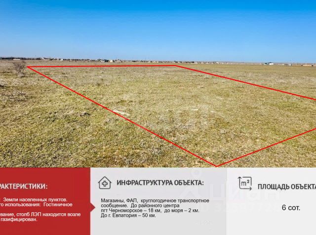 Продается земельный участок 98,33 сотки в селе Громово Черноморского района. Разрешенное использование - ЛПХ, земли населенных пунктов. Участок ровный, правильной прямоугольной формы. Межевание проведено. В селе есть газификация, по границе участка проходит линия электропередач, вопрос водоснабжения решается путем бурения индивидуальной скважины. В пешей доступности находится вся необходимая сельская инфраструктура: магазины, фельдшерско-акушерский пункт и остановка общественного транспорта, откуда ходят круглогодично регулярные автобусы. До районного центра пгт Черноморское всего 18 км. Ключевым преимуществом является близость к морю: всего 2 км до песчаных пляжей. Расстояние до районного центра Черноморское составляет 20 км, а до города Евпатория — 50 км. Документы оформлены по российским стандартам, и мы готовы рассмотреть любые варианты оплаты. Звоните или пишите — буду рада ответить на все ваши вопросы и организовать показ. МЫ ГАРАНТИРУЕМ ФИНАНСОВУЮ БЕЗОПАСНОСТЬ ДЛЯ НАШИХ КЛИЕНТОВ. Полное юридическое сопровождение сделки. Высокий шанс одобрения ипотеки. Звоните, с удовольствием ответим на ваши вопросы! Код пользователя: 183659 Номер в базе: 12218759
