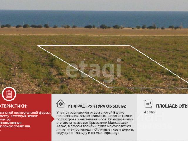 Продается участок 4 сотки в СНТ Серебряный Крым, возле с. Знаменское. Участок ровный, правильной прямоугольной формы, не огорожен по периметру. Категория земли: Земли населенных пунктов. Вид разрешенного использования: Ведение личного подсобного хозяйства на полевых участках. Участок расположен рядом с косой Беляус, где находятся самые красивые, широкие пляжи полуострова и чистейшее море, благодаря чему это место называют Крымскими Мальдивами. Красивые, экологически чистые места, с огромным туристическим и инвестиционным потенциалом. Местность активно застраивается. С 2024 года земельный участок вошел в рекреационную зону, что может быть интересным для развития туристического бизнеса или для личного использования в качестве места для отдыха и релаксации. Также, в скором времени будет монтироваться линия электропередач. Отличные новые дороги, ведущие в Тавриду и на мыс Тарханкут. Документы РФ. Звоните, отвечу на все интересующие вопросы. МЫ ГАРАНТИРУЕМ ФИНАНСОВУЮ БЕЗОПАСНОСТЬ ДЛЯ НАШИХ КЛИЕНТОВ. Полное юридическое сопровождение сделки. Высокий шанс одобрения ипотеки. Звоните, с удовольствием ответим на ваши вопросы! Код пользователя: 182478 Номер в базе: 4860038