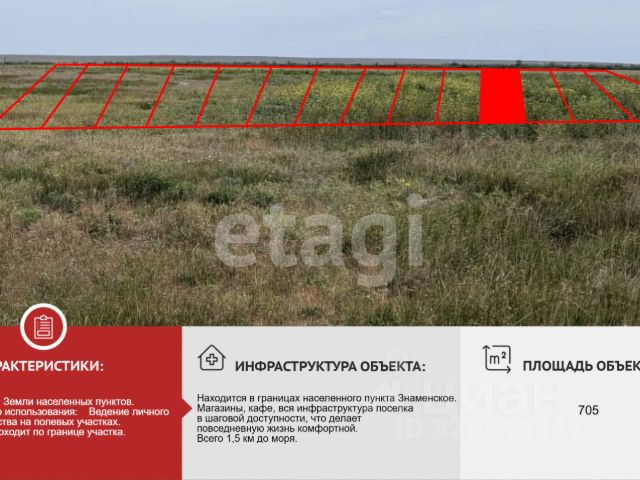 Продается участок 7,05 сотки в живописной местности! Находится в границах населенного пункта Знаменское. Вид разрешенного использования земли - ЛПХ. Участок прямоугольной формы, ровный. Готов для строительства без дополнительных затрат на выравнивание. Электричество проходит по границе участка. Новая, перспективная нарезка под застройку. Магазины, кафе, вся инфраструктура поселка в шаговой доступности, что делает повседневную жизнь комфортной. Всего 1,5 км до моря. Участок расположен рядом с косой Беляус, где находятся самые красивые пляжи полуострова. Благодаря чистейшей бирюзовой воде и очень светлому, почти белому песку это место называют Крымскими Мальдивами. Имеется возможность приобретения нескольких смежных участков для масштабных проектов. Один собственник, документы РФ. Звоните! МЫ ГАРАНТИРУЕМ ФИНАНСОВУЮ БЕЗОПАСНОСТЬ ДЛЯ НАШИХ КЛИЕНТОВ. Полное юридическое сопровождение сделки. Высокий шанс одобрения ипотеки. Звоните, с удовольствием ответим на ваши вопросы! Код пользователя: 183659 Номер в базе: 10914898