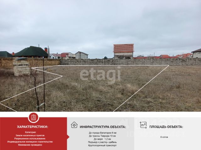 Объект 580. Продам земельный участок площадью 5,6 соток, пгт. Заозёрное в районе Песчанка, пригород Евпатории. Документы РФ, проведено межевание. Категория земель: Земли населённых пунктов. Разрешенное использование: Индивидуальное жилищное строительство. Коммуникации: электричество подключено, вода центральные и газ в перспективе. Участок огорожен забором, подключено электричество. Рядом расположены, гостиницы, дома. На лечение грязями в Заозерном ежегодно приезжает огромное количество отдыхающих, для эффективного оздоровления. В регионе располагается более десятка соленых озер с уникальными по составу грязями и рапой, которые широко используют в местных санаториях. Самым известным считается озеро Мойнаки около Евпатории, и именно его богатства используют во время лечения грязями в Заозерном. Прямой выход к пляжу (песчаный берег). Участок расположены 800 метров от моря, 10 км до Евпатории. Городская транспортная развязка в 7 минутах. Земельный участок в поселке городского типа Заозерное республики Крым.