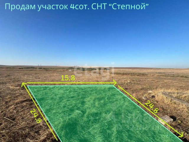 Продаётся земельный участок 4 сот. СНТ "Степной" с отличной инвестиционной перспективой ! Инвестиционные преимущества: - С началом развития инфраструктуры (многоэтажные дома, школы, магазины, парковки) стоимость земель вырастет — хороший потенциал прироста капитала. - Планируемая соц. инфраструктура повышает ликвидность — привлекательность для семей и арендаторов. - Подходит для разных сценариев: дачное использование, индивидуальное строительство, инвестиционная перепродажа. Преимущества участка: - Ровный, правильной формы - Рядом у соседей Вода, Свет, Газ Локация и доступность: -Автобусная остановка 500-700м. (Автобус ходит каждые 40 мин.) - 10 км до центра Феодосии — всё необходимое в пределах досягаемости. - 10 км до "Золотого пляжа" — чистое море и пляжная инфраструктура рядом. Возможно Вы искали: купить земельный участок Крым, купить землю в Крыму, купить участок земли в Крыму. Готовы организовать показ в удобное для вас время. МЫ ГАРАНТИРУЕМ ФИНАНСОВУЮ БЕЗОПАСНОСТЬ ДЛЯ НАШИХ КЛИЕНТОВ. Полное юридическое сопровождение сделки. Высокий шанс одобрения ипотеки. Звоните, с удовольствием ответим на ваши вопросы! Код пользователя: 179151 Номер в базе: 9841980