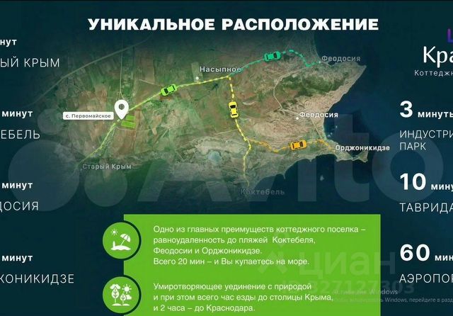 СРОЧНАЯ ПРОДАЖА, ЦЕНА СНИЖЕНА Вашему вниманию предлагается участок в границах развитого населенного пункта. Категория земель ИЖС, электричество 15 кв, возможность подведения газа, водоснабжение - центральное, участок правильной формы. В 15 минутах на авто Феодосия, курортный город с полноценной городской инфраструктурой - школы, учебные заведения, школа искусств, музеи. В 20 минутах от поселка строится индустриальный парк Феодосия - потенциальная площадка для развития бизнеса и работы. Чистейшие ракушечные пляжи Первомайского в 15 минутах езды. В 20 минутах на авто Коктебель и масса природных достопримечательностей. В поселке Первомайское расположена вся инфраструктура, необходимая для комфортной жизни - школа, детский сад, амбулатория семейной медицины, дом культуры. В 7 минутах трасса Таврида, которая позволит максимально быстро и без пробок добраться до любой точки как полуострова, так и материка. Рассмотрим любые формы расчетов. Проходит ипотека, полная стоимость в договоре купли - продажи. Я - собственник.