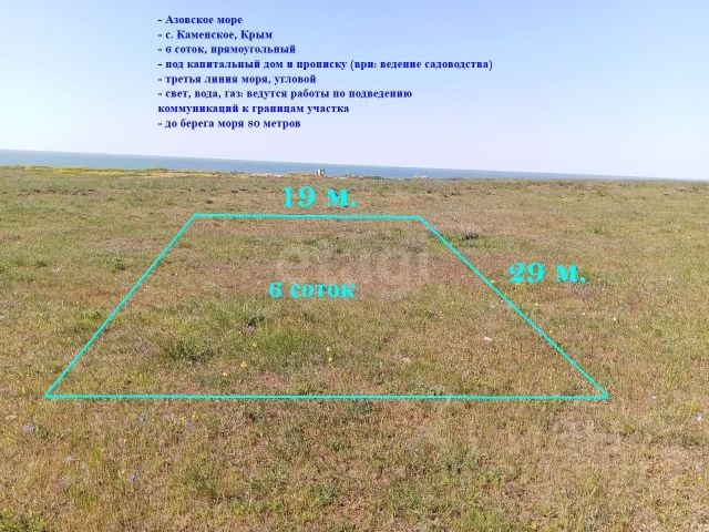 Продается уникальный участок площадью 6 соток в живописном селе Каменское, всего в 1 километре от берегов ласкового Азовского моря! Это идеальное место для тех, кто ценит спокойствие и уединение вдали от шумных курортов. Участок имеет ровную прямоугольную форму и уже прошел межевание, что делает его готовым к строительству вашей мечты. Село расположено в экологически чистом районе на начале Арабатской стрелки, где свежий морской воздух и прекрасные пейзажи создают атмосферу гармонии и умиротворения. Участок не подвержен подтоплениям, а возможность бурения скважины гарантирует вам доступ к чистой питьевой воде. Целевое назначение участка ведение садоводства, что открывает перед вами множество возможностей для создания собственного оазиса. В селе активно развиваются инфраструктура и сервисы: здесь есть магазины, рынок, уютные кафе, а также множество пансионатов и баз отдыха. Для любителей активного отдыха на территории села построен крытый бассейн, а также начато строительство большого ресторана. Удобное расположение: всего 30 минут до Феодосии, менее часа до Керчи, а до Симферополя можно добраться на поезде ближайшая станция находится всего в 7 км в селе Семисотка. В село подведены газ и водопровод, что делает жизнь здесь комфортной и удобной. Не упустите шанс стать владельцем земельного участка в этом потрясающем уголке Крыма! Оформлено право собственности по РФ. Звоните прямо сейчас и записывайтесь на просмотр ваша мечта о собственном доме у моря может стать реальностью! МЫ ГАРАНТИРУЕМ ФИНАНСОВУЮ БЕЗОПАСНОСТЬ ДЛЯ НАШИХ КЛИЕНТОВ. Полное юридическое сопровождение сделки. Высокий шанс одобрения ипотеки. Звоните, с удовольствием ответим на ваши вопросы! Код пользователя: 140110 Номер в базе: 7772966