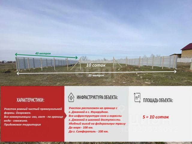 Продается земельный участок, 10 соток, ИЖС,Джанкойский район, с. Изумрудное! Участок находится в районе "Черёмушки", в черте города! Рядом вся инфраструктура, садик, школа, магазины. Все коммуникации проходят возле участка. Недалеко два озера и Северо-Крымский канал.Рядом выезд на трассу Москва-Симферополь. Идеальное место и цена. Построив свой дом Вы будете довольны всем. Участок настолько велик, что Вы можете не ограничивать себя в любых постройках. Отдельно компания Этажи предлагает подряд на строительство дома под ключ от 2 до 6 месяцев на эксклюзивных и самых выгодных условиях оот ведущих строительных компаний Крыма! При строительстве дома можно воспользоваться ипотекой, материнским капиталом,жилищным сертификатом. Есть возможность скорректировать планировку типового проекта с учетом Ваших индивидуальных потребностей. В настоящее время действуют акции и скидки, о деталях которых Вы можете узнать, позвонив нам! Номер объекта:2829994 МЫ ГАРАНТИРУЕМ ФИНАНСОВУЮ БЕЗОПАСНОСТЬ ДЛЯ НАШИХ КЛИЕНТОВ. Полное юридическое сопровождение сделки. Высокий шанс одобрения ипотеки. Звоните, с удовольствием ответим на ваши вопросы! Код пользователя: 189436 Номер в базе: 2829994
