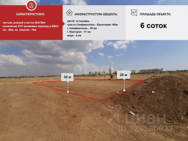 Продается земельный участок в курортном городе Саки! Участок площадью 6 соток располагается в новом массиве, в 4 км от просторных песчаных пляжей. До центра города 2 км. 1,5 км до прогулочной зоны города - Набережной сакского соленого озера. Участок на перспективу,под строительство жилого дома. Размеры участка (21 на 28 метров) позволяет разместить дом, гараж или навес, зону отдыха,мангальную зону. Участок угловой, что позволяет организовать входные зоны с двух сторон. В ближайшей перспективе планируется проведение коммуникаций в данный массив. Не упустите возможность приобрести участок недалеко от моря! Наша комиссия 59000 р.+1% от стоимости объекта, но не менее 70000 р. МЫ ГАРАНТИРУЕМ ФИНАНСОВУЮ БЕЗОПАСНОСТЬ ДЛЯ НАШИХ КЛИЕНТОВ. Полное юридическое сопровождение сделки. Высокий шанс одобрения ипотеки. Звоните, с удовольствием ответим на ваши вопросы! Код пользователя: 113474 Номер в базе: 6814065