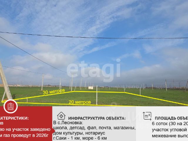 Земельный участок площадью 6 соток расположен в селе Лесновка (Сакский район, Западный Крым) — перспективном и быстро развивающемся районе. Участок имеет правильную прямоугольную форму, что упрощает планировку и строительство. Его размеры позволяют возвести просторный жилой дом с хозяйственными постройками, гаражом и зоной отдыха, сохранив при этом комфортное расстояние до границ территории.