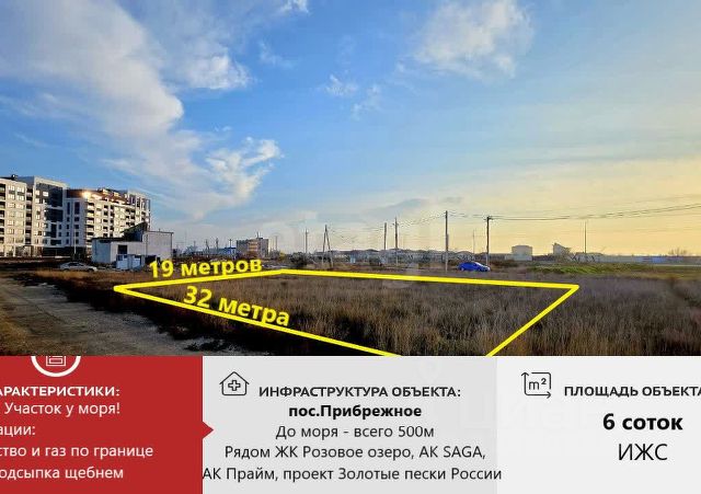 УЧАСТОК У МОРЯ В КРЫМУ! Участок в 500м от шикарного пляжа в п.Прибрежное, Сакского р-на, Крым. Вид разрешенного использования - ИЖС. Участок располагается в уникальной локации: между морем и Розовым озером! Рядом построена и сдана в эксплуатацию первая очередь ЖК Розовое озеро. На берегу моря строятся несколько комплексов: Saga, Прайм, скоро начнется грандиозна строительство по федеральному проекту "Золотые пески России", которые привлекут большой поток туристов и повысит качество инфраструктуры. Параметры участка: * 6 соток, * размеры - 32 метра по фасаду и 19 метров в глубину, * Вид разрешенного использования - ИЖС, земли населенных пунктов. Коммуникации: * Электричество и газ проходят по границе участка * Водопровод - в ближайшей перспективе * участок находится в переулке, т.е. по улице не будут проезжать транзитные автомобили. Дорога подсыпана щебнем. Ищете участок у моря для проживания, для летнего отдыха, для инвестиции или для ведения бизнеса? Этот участок удовлетворит все ваши потребности! Приезжайте, смотрите, покупайте! Возможен онлайн-показ, а также удаленная сделка через Сбер! Наша комиссия 59000 р.+1% от стоимости объекта, но не менее 70000 р. МЫ ГАРАНТИРУЕМ ФИНАНСОВУЮ БЕЗОПАСНОСТЬ ДЛЯ НАШИХ КЛИЕНТОВ. Полное юридическое сопровождение сделки. Высокий шанс одобрения ипотеки. Звоните, с удовольствием ответим на ваши вопросы! Код пользователя: 113474 Номер в базе: 10519868