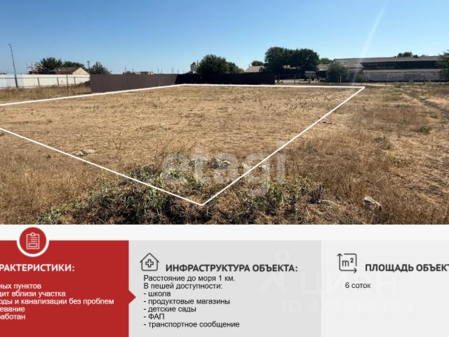 Земельный участок 6,88 сот, в 3 км от моря, с прекрасными песчаными пляжами. Рядом по улице застроены дома, на соседней улице проходят коммуникации, не далеко от участка стоит столб под электричество, в 2025 году подведут газ.Море находится в 3 км от участка. В селе развита вся инфраструктура, есть новый детский сад, школа. Полный пакет российских документов на продажу. Коммуникации рядом. До города Евпатория - 6 км. Звоните, отвечу на все интересующие вопросы. Код пользователя: 138370 Номер в базе: 6781208