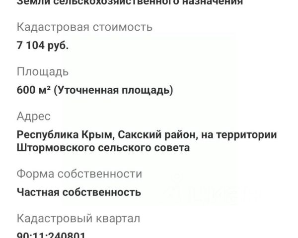 Продается земельный участок площадью 5 соток, расположенный на берегу черного моря в 400 метрах от уреза воды, в прекрасном тихом прибрежном поселке Витино. Витино-это небольшой прибрежный поселок вдоль берега Черного моря, здесь отличные песчаные пляжи, еще кусочки нетронутой дикой природы что привлекают туристов для отдыха как на один день так и на несколько с палатками. В поселке имеется вся необходимая инфраструктура:школа, садик, магазины, кафе, автобусное сообщение. Расстояние до города Евпатория 20 км. Вид разрешённого использования - размещение дачных домов и садовых домов (СНТ)Возможно строительство жилого дома с последующей регистрацией права собственности. Коммуникации: Электричество вдоль массива. Подключение прямое по договорному с Крымэнерго по стоимости 3000 рублей 1 киловатт. Вода скважина. Глубина 10-15 метров, вода пресная. Экологически чистый район, 320 солнечных дней в году и всегда чистое небо. Песчаный пляж, пологий берег, прозрачная, тёплая вода. Документы: Право собственности зарегистрировано в РФ, границы уточнены, один собственник. Новый, быстроразвивающийся массив, активно застраивается частными домами и минипансионатами.